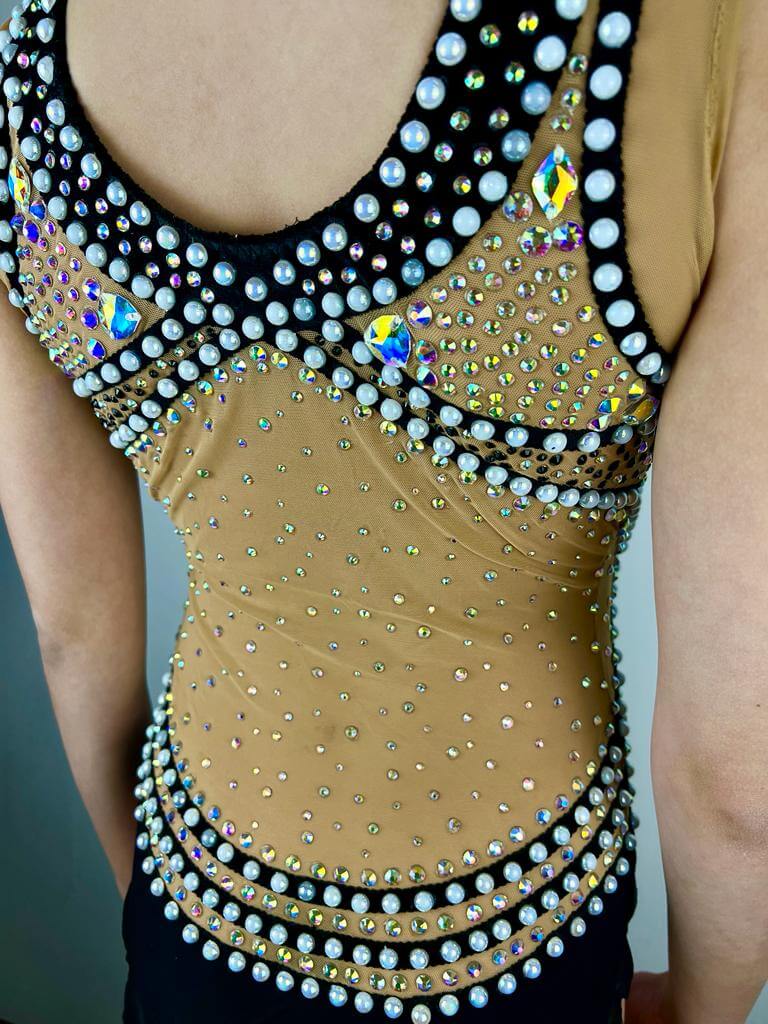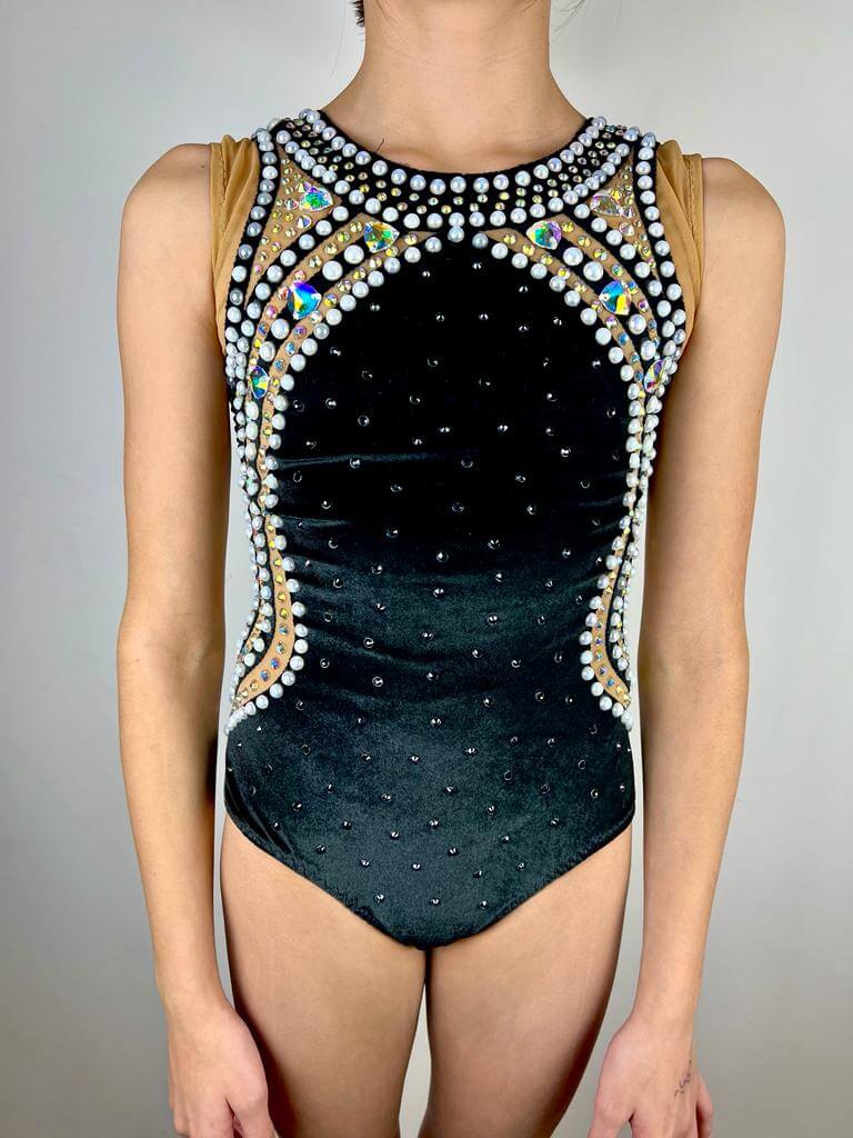 Rhythmic gymnastics leotard, for height around 146 cm, girth 60cm, hips 2x28cm, bust 2x30-31 cm. All measurements without stretching.