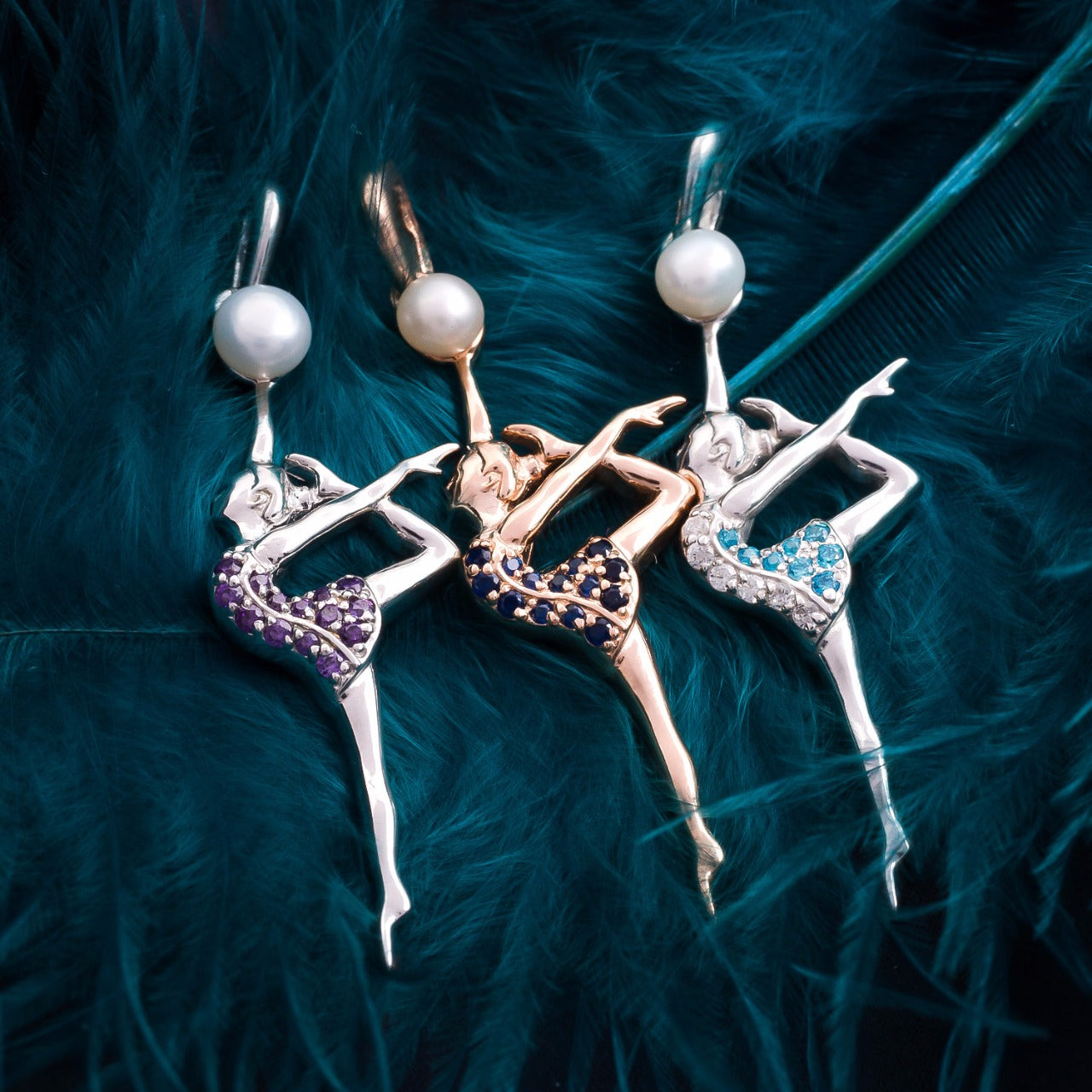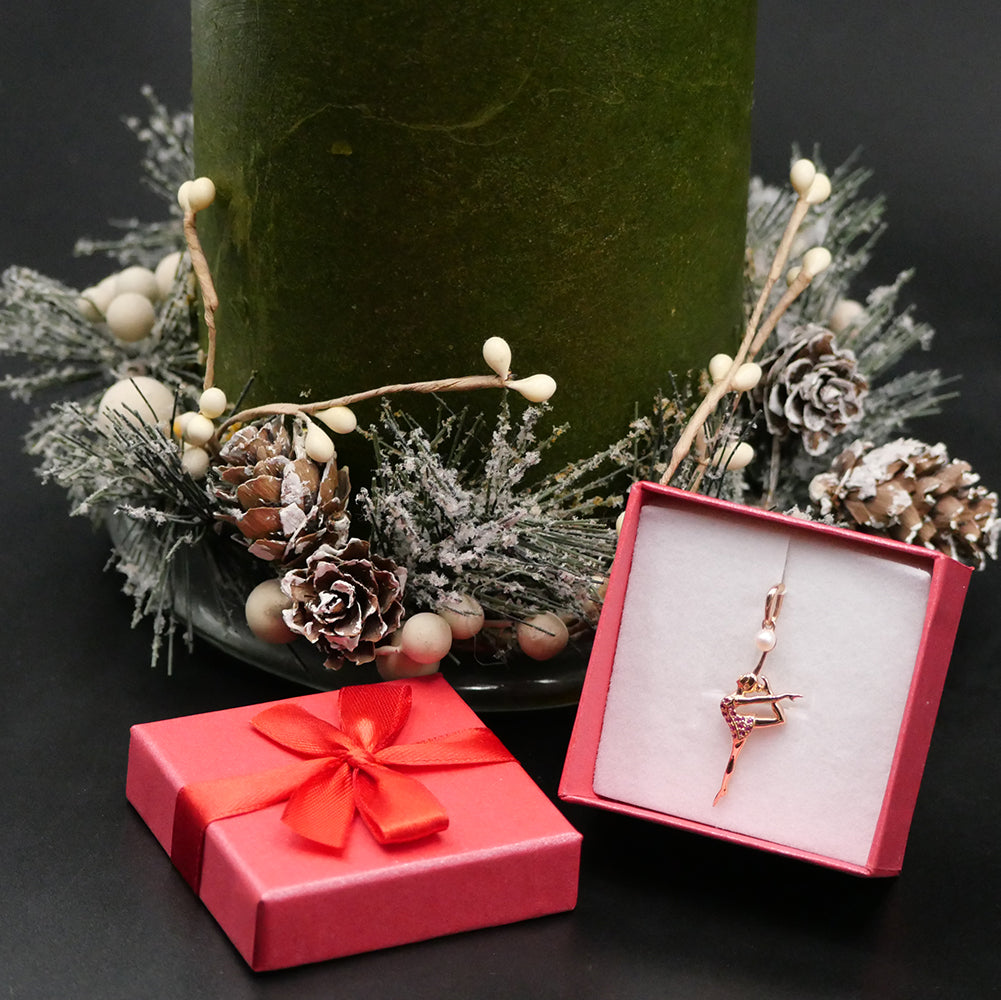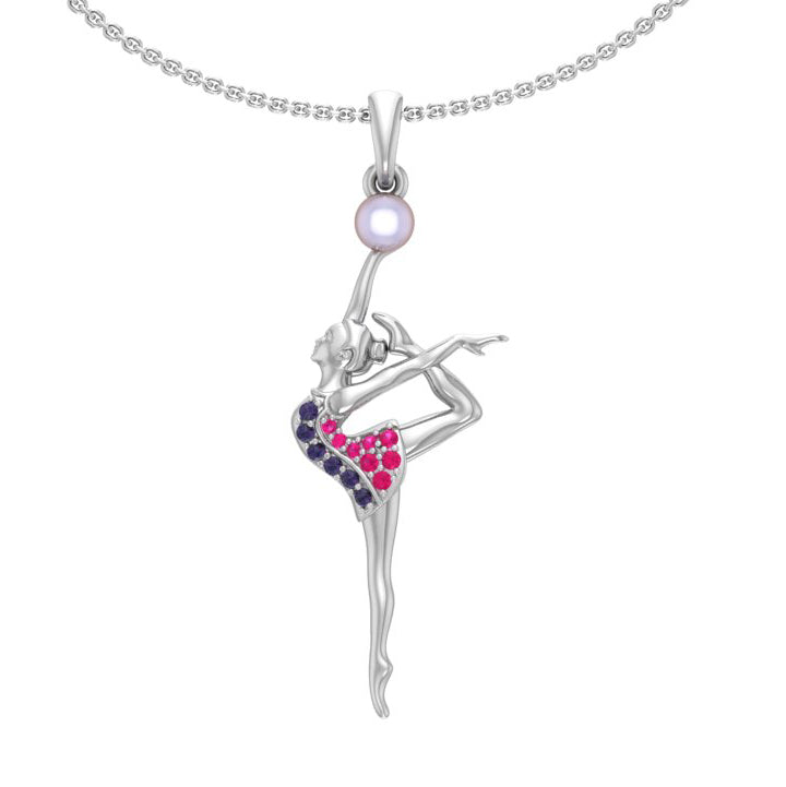 Stunning necklace with pendants in the form of a beautiful gymnast silhouette holding a ball made from a natural pearl will make a piece of unique jewelry for anyone with a passion for RG.