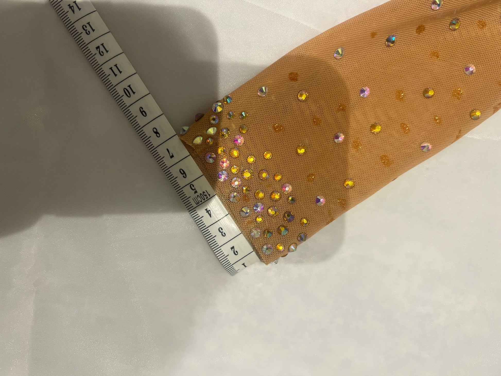 Beautiful handmade leotard adorned with high quality stones, brand new. Please see the photo with the measurements below.