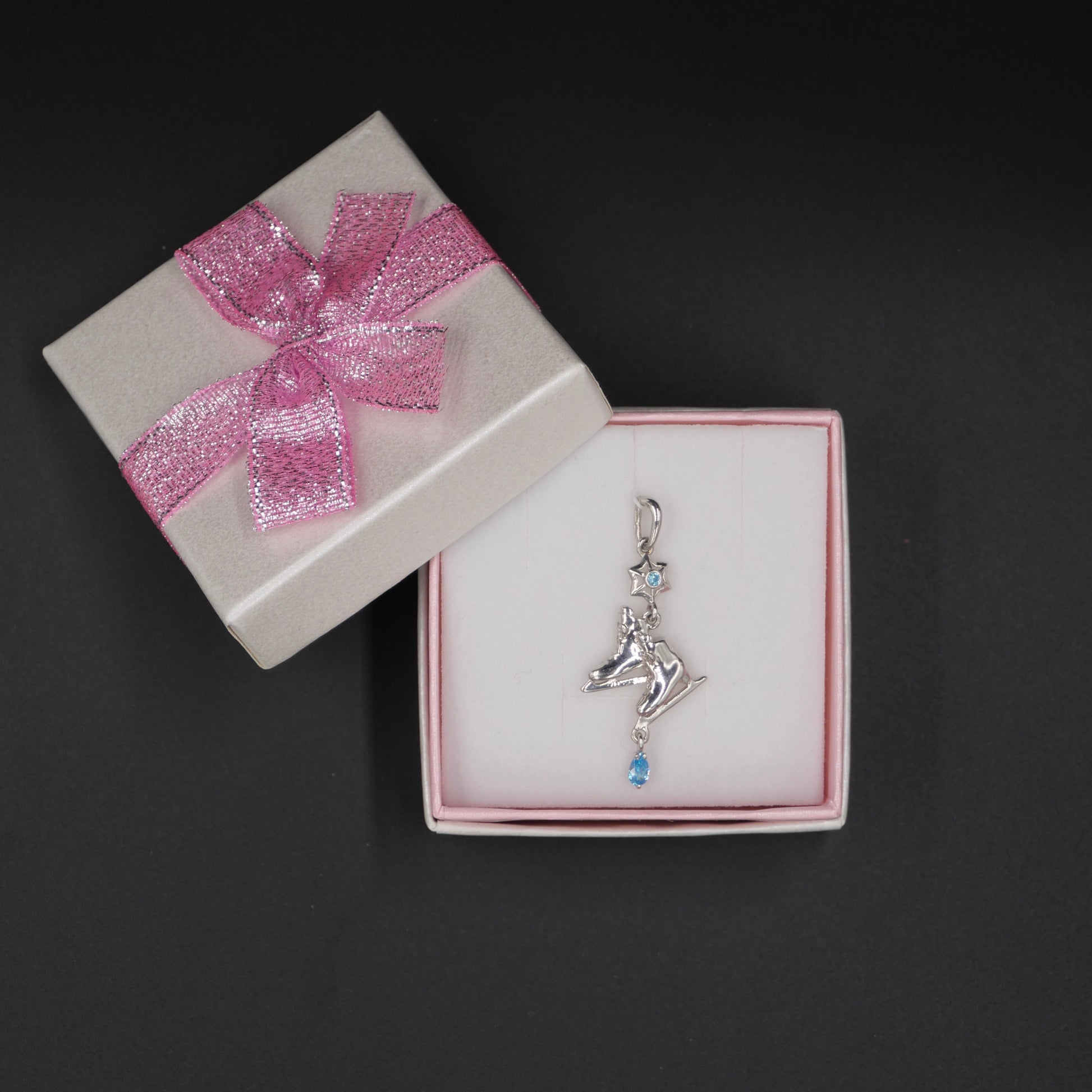 This stunning pendant is a perfect gift for anyone who loves figure skating! Designer jewellery brand “Sabira”, handmade from sterling silver and available in natural or goldplated finish it is adorned with blue or white gemstones to add an extra spark.