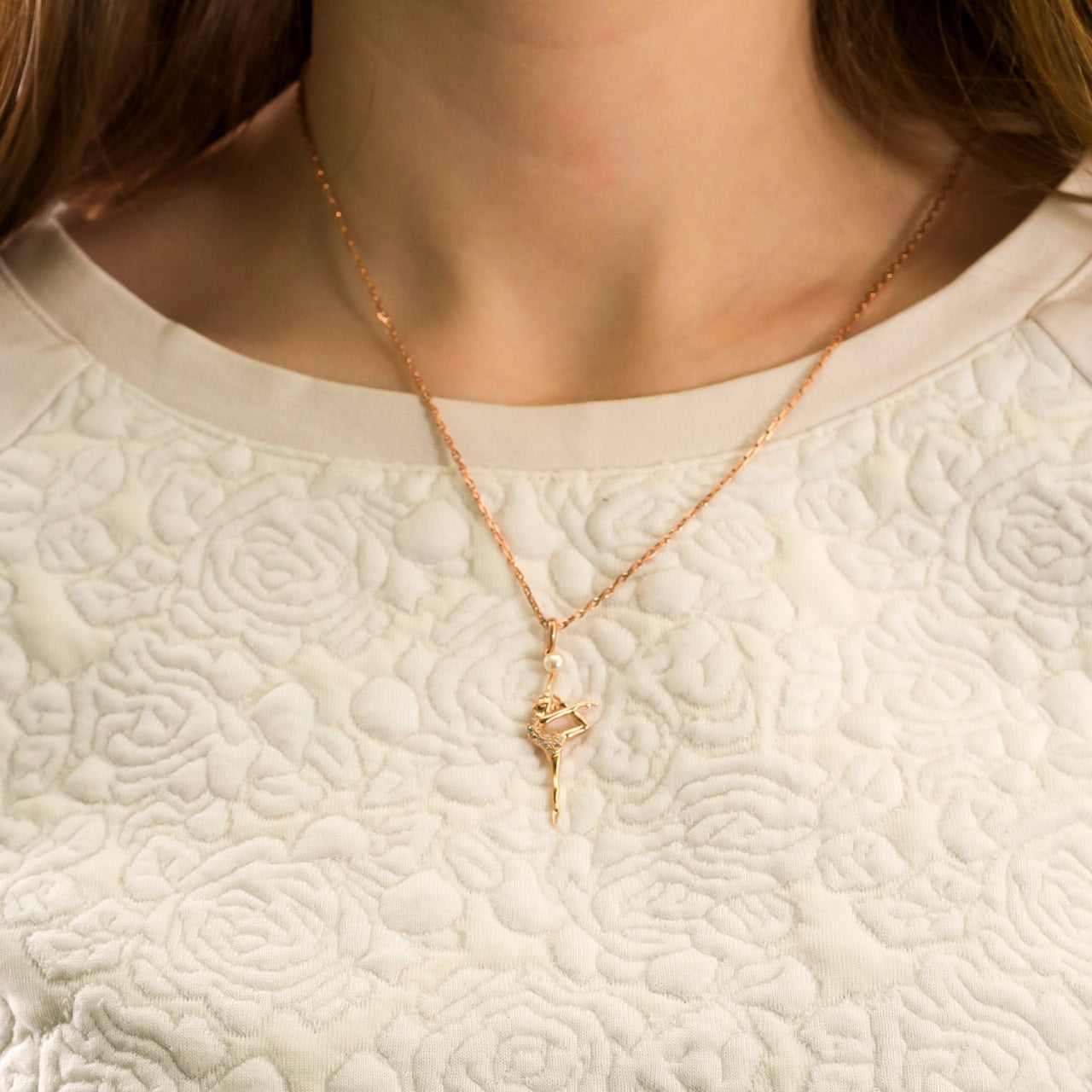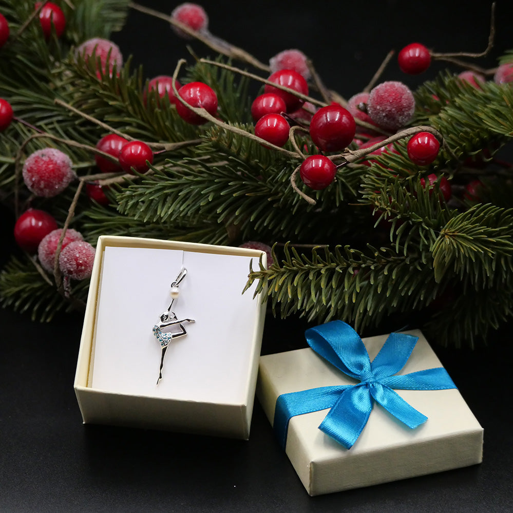 Stunning necklace with pendants in the form of a beautiful gymnast silhouette holding a ball made from a natural pearl will make a piece of unique jewelry for anyone with a passion for RG.