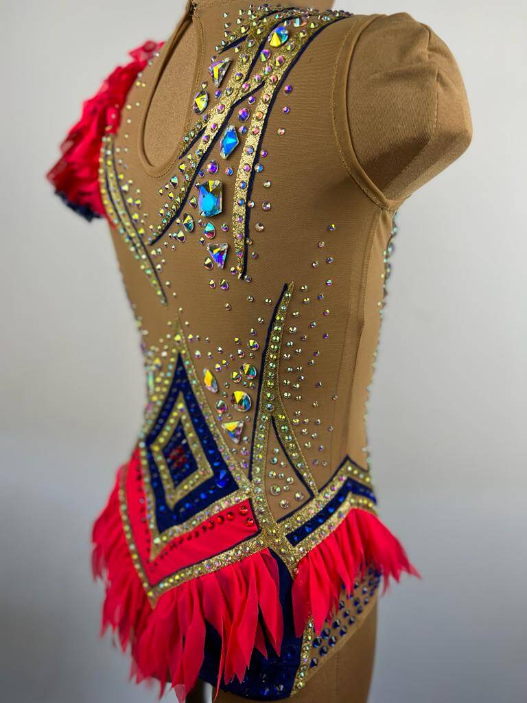 Rhythmic gymnastics leotard, for height around 134-146 cm, girth 58cm, hips 2x28.5cm, bust 2x31 cm. All measurements without stretching.