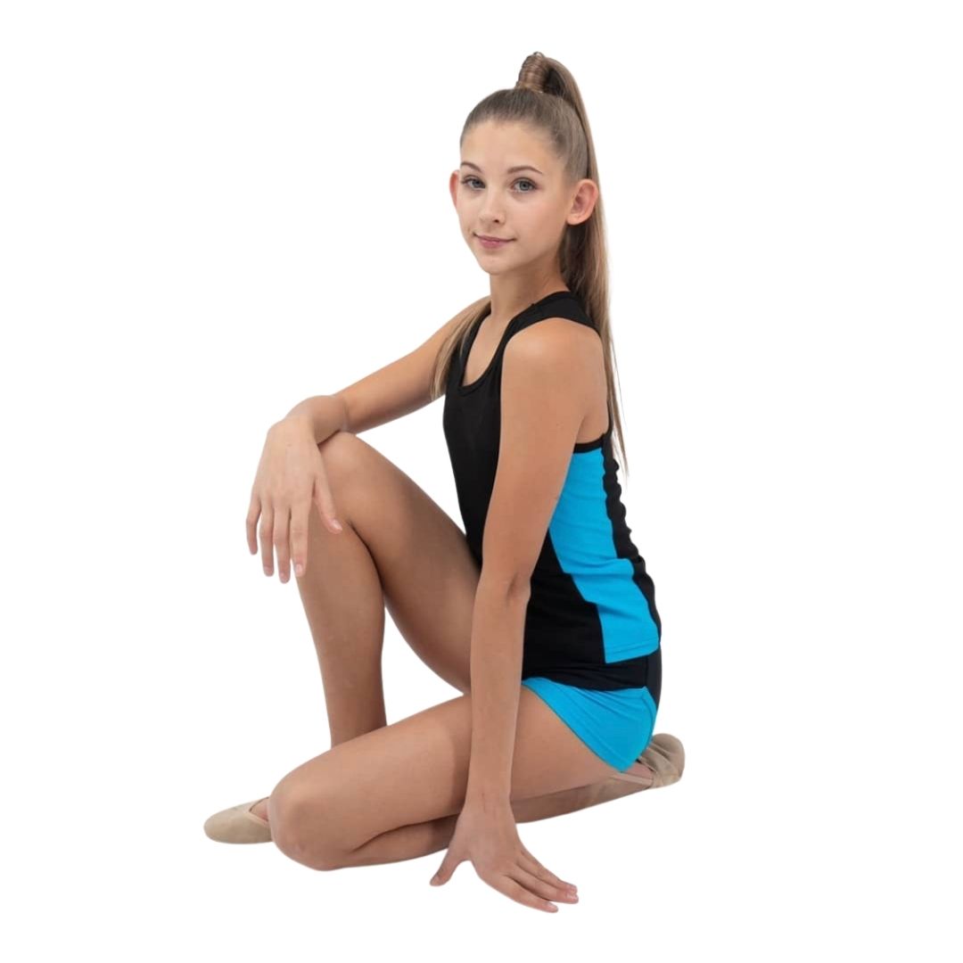 A tank top for rhythmic gymnastics and dance. Material is soft, breathable, and ideal for those with sensitive skin. Can be matched with double shorts from the same collection.